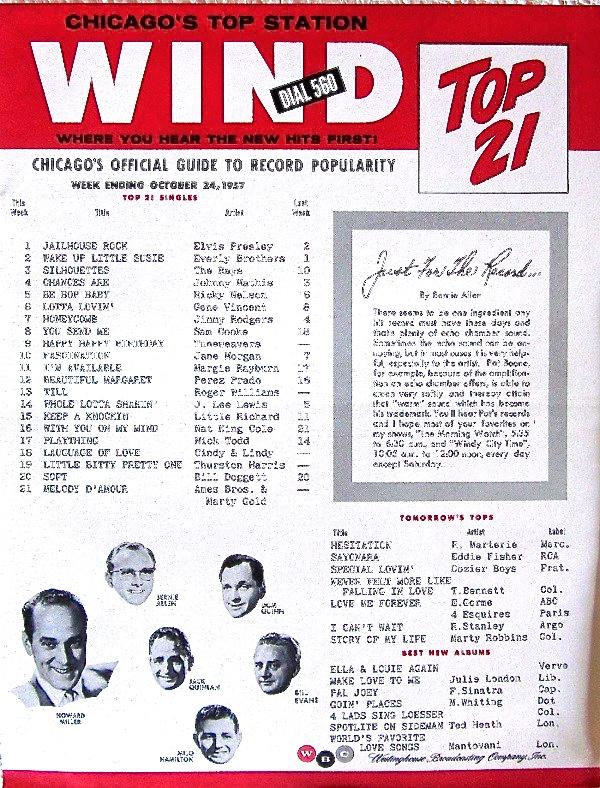 WIND (560AM) was one of the first stations to play rock and roll with perhaps the first celebrity DJ, Howard Miller. He started at WIND in 1947, and was one of their top money producers due to his huge following, of mainly women. Howard was so popular that WIND allowed him do a daily ½-hour morning record show on WBBM, and a 1-hour afternoon show on WMAQ. From ~1956 to 1960, WIND DJ'S hosted Sunday record hops (75¢ admission), and various venues with performers ranging from Little Richard, to Connie Frances and Jackie DeShannon. Other Chicago