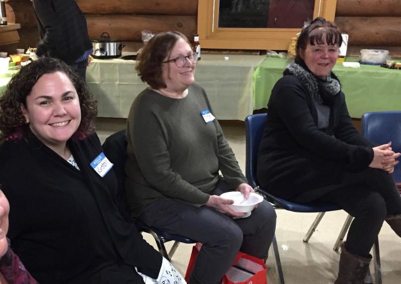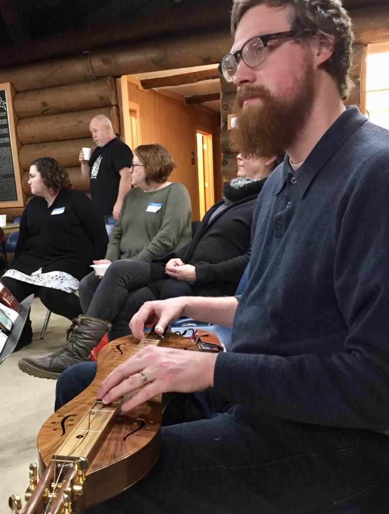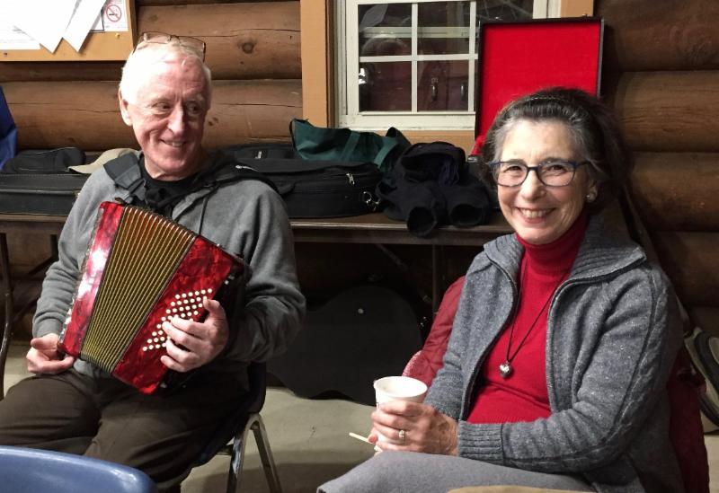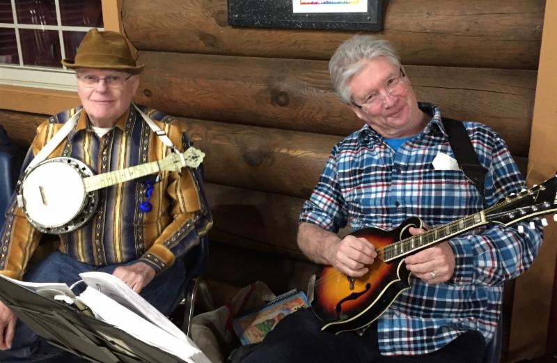 Wintery weather kept some folks away, but an enthusiastic crowd gathered on January 26 for our Annual Plank Road Membership Meeting at the Log Cabin in Lombard. Outside, the snow was falling, but the warmth of shared music, conversation and a table of tasty food made up for it. As always, the sing-around was led by the indefatigable George Mattson, who made sure everyone had a chance to choose a song.
