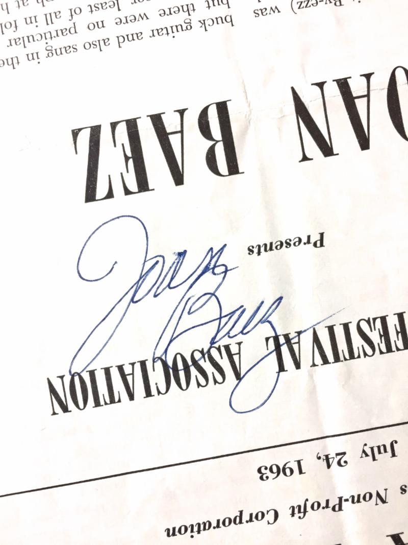 When the concert ended, a group gathered by a door on the left side of the stage. They seemed to know something . . . so I joined them. In a few moments, Joan Baez stepped out and graciously started signing autographs. I handed her my Ravinia program, she signed it, then handed it back to me (our fingers almost touched). And she looked me straight in the eye with a gorgeous big smile which I can picture to this day. I was a goner. A crush I never got over. Do you think she remembers?
