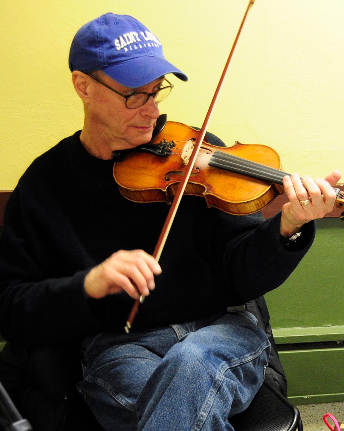 Bob lived in Lombard since 1992, and years later he met the Jones family through Jennifer Shilt when his daughter took lessons from them. He began playing mandolin and eventually fiddle, taking lessons from Cathy Jones. "Cathy taught an ensemble group on Thursday nights which led to our current group, and ultimately to our band Blind Squirrel."